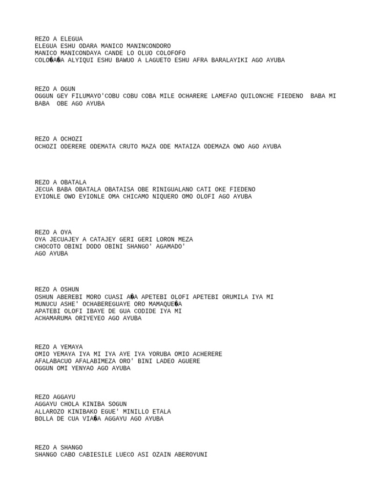 REZO A ELEGUA Eshu Elegua oga gbogbo na mirin ita algbana baba mi mulo na buruku nitosi le choncho kuelu kuikuo oki cosi ofo cosi eyo cosi iku cosi ano cosi ia cosi araye cosi idina cosi egba cosi fitibo bogbo osobo unlo fun ire owo ire omo ire ariku babawa ire ariku iyawa ni oruko mi gbogbo omonile fu kuikuo moducue baba mi Elegua Mensajero divino. OGGUN GEY FILUMAYOCOBU COBU COBA MILE OCHARERE LAMEFAO QUILONCHE FIEDENO BABA. Otrupon bolufon tio kanle erekan orun adifafun obatala umbati iku ifa osuburu iku arun ofo eyo kaferefun obatala ati elegua.