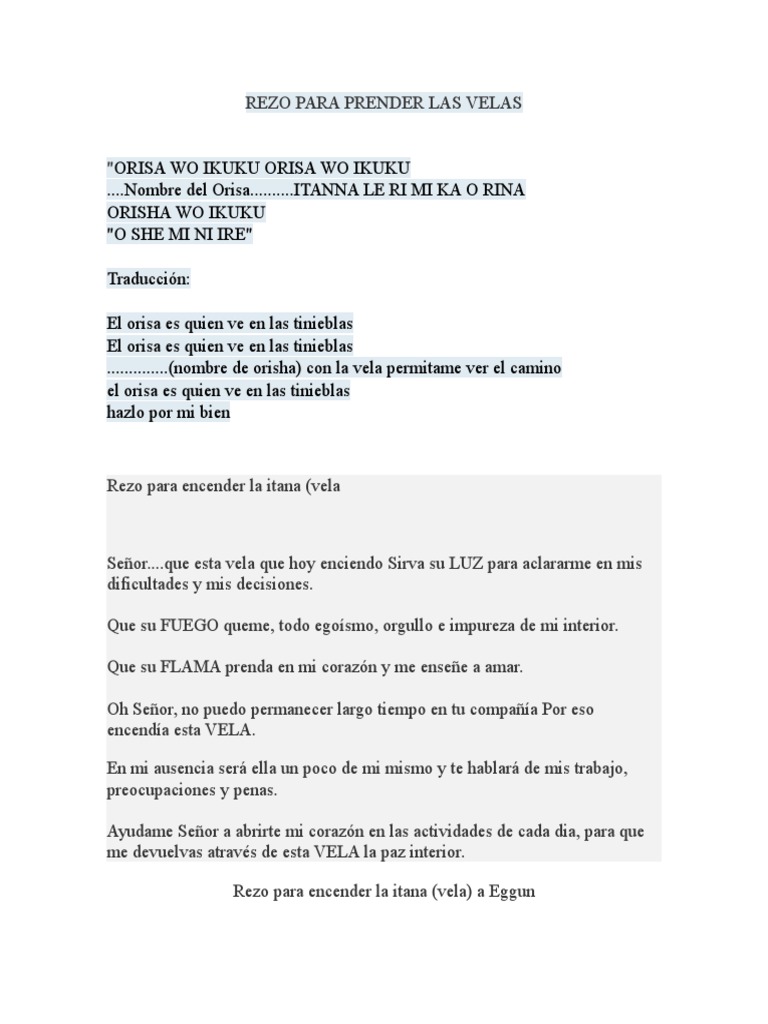 Rezo para prender vela a elegua. Bendceme para que nada me lastime fsica o emocionalmente y sea cada vez ms valiente. El orisa es quien ve en las tinieblas El orisa es quien ve en las tinieblas. Baba Mi Eggun Lelekun Itana Eggun Lelekun Rezo para poner la Itana velaa Eggun.