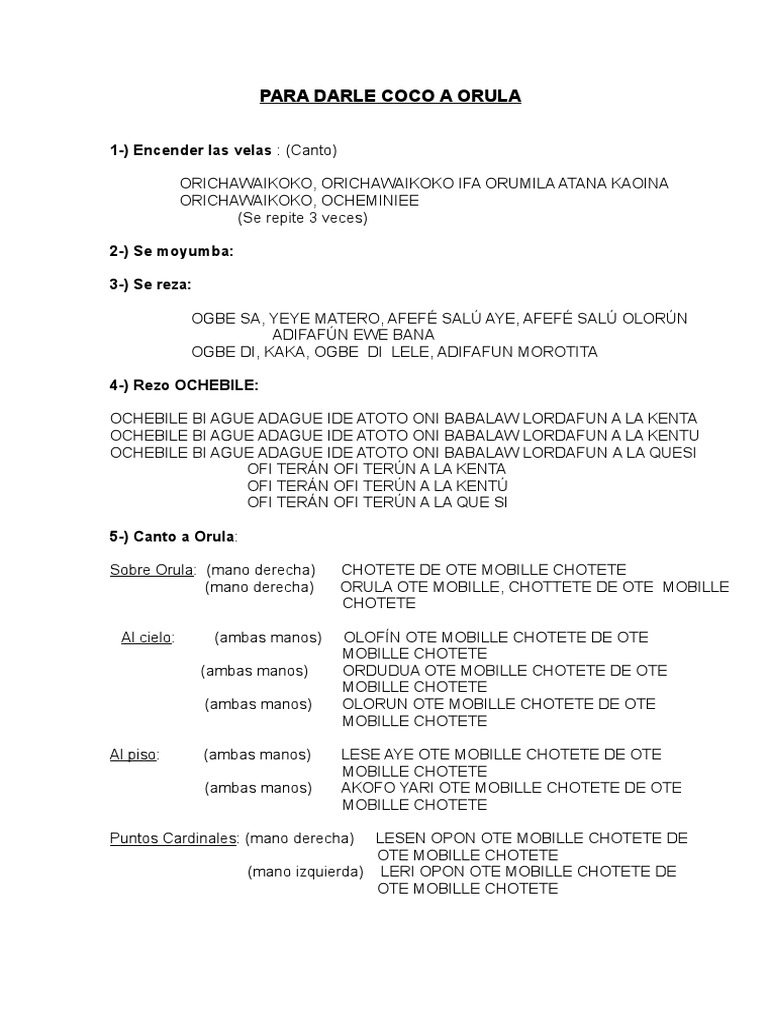 Llegues ya no estar. Ya colocado en el piso se pondrn los siguientes elementos 1 estera 2 platos o candelabros para colocar las velas 2 platos donde se situarn los cocos una moneda de. Quin debe despertar a Orula.